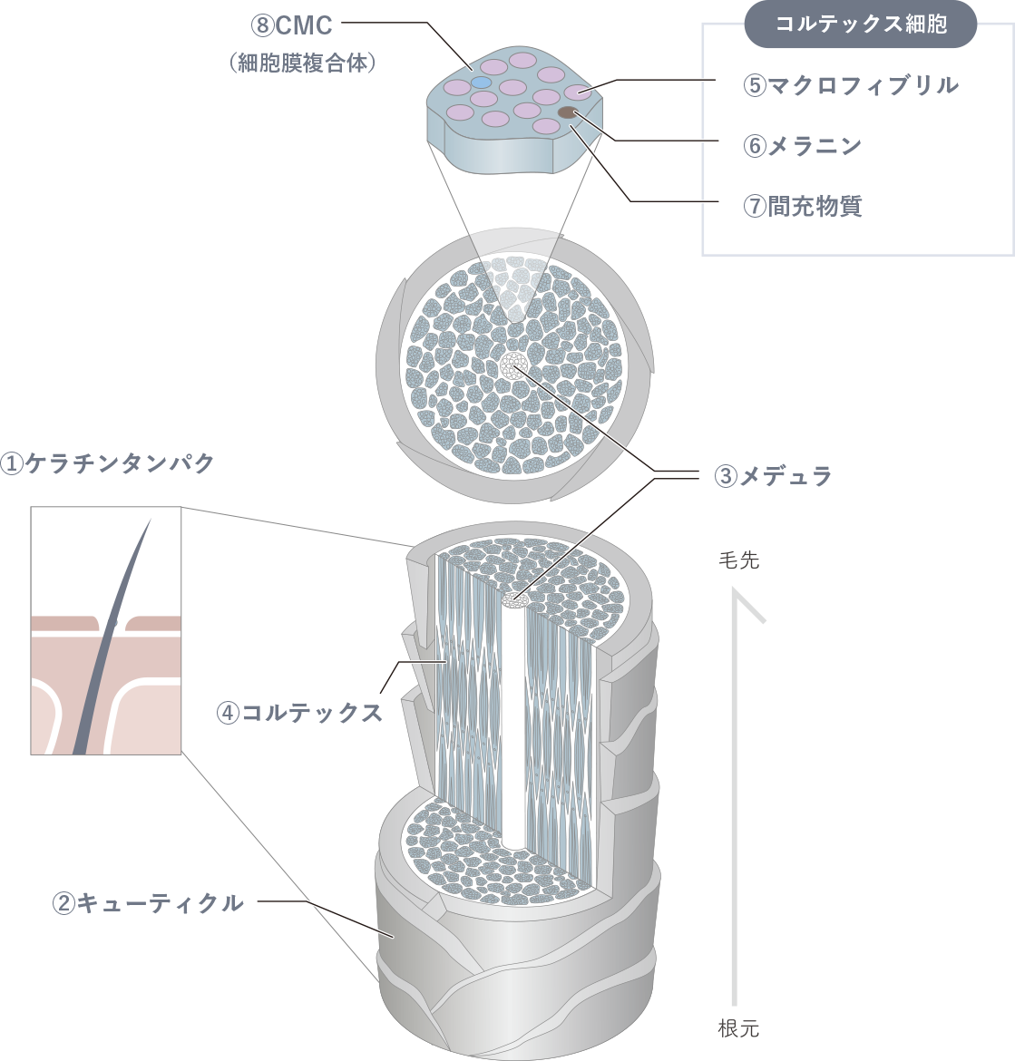 細胞膜複合体の略。髪の内部を延びる通り道のような形状で、キューティクルやコルテックスの細胞同士をつなぐ組織です。髪を理想的な状態に保つための水分や栄養素、またヘアカラーやパーマ薬剤、トリートメントなどを運びます。