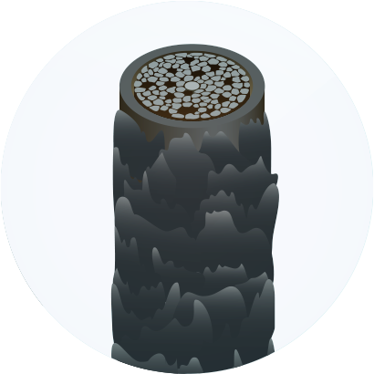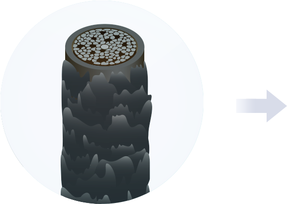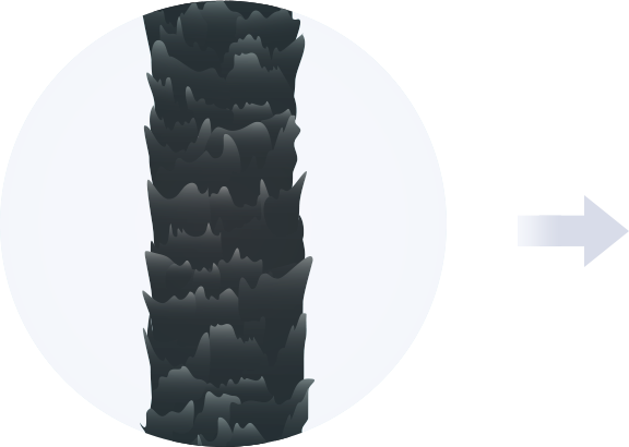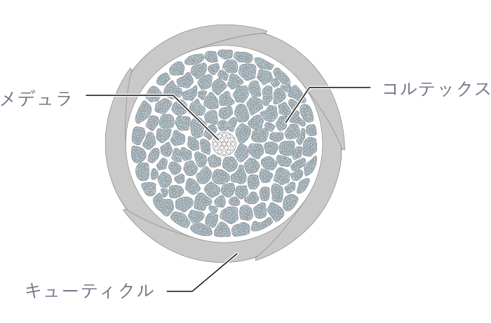 コルテックスの量が多くしっかりしていて潤い・栄養分が最適な状態に保たれている状態です。また、キューティクルがびっしり隙間なく重なり、内部組織の流出がありません。