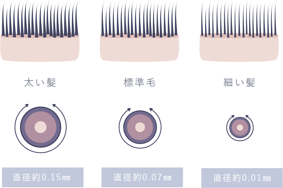 硬毛は、髪が太く硬くハリコシがある状態。キューティクル枚数が多く、髪内部にあるタンパク質なども多く、髪自体がしっかりしているのでボリュームが出やすいです。